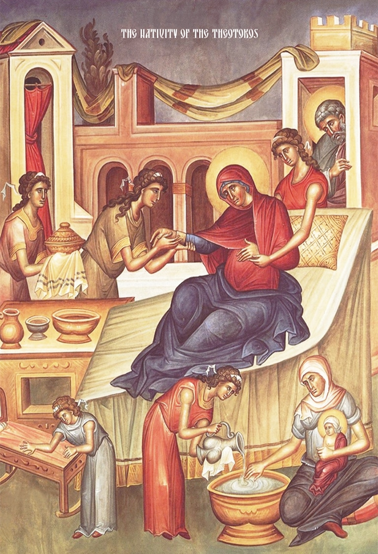 When nine months had passed, Anna gave birth, and asked the midwife, “Whom have I brought into the world?” “A daughter,” she replied. “My soul has been magnified this day,” exclaimed Anna and gently laid the child down. And when the days of her purification according to the Law were accomplished, she arose, washed, gave suck to the child and called her Mary, the name obscurely awaited by the Patriarchs, the Prophets and the Righteous, and by which God would reveal the mystery hidden from all eternity.